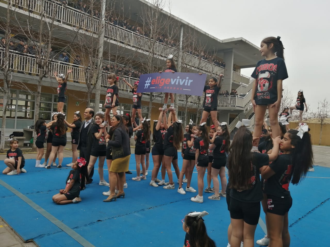 En el Centro Educacional La Florida los alumnos cheerleaders realizan presentación para celebrar el premio obtenido en el concurso #MiColegioEVSD