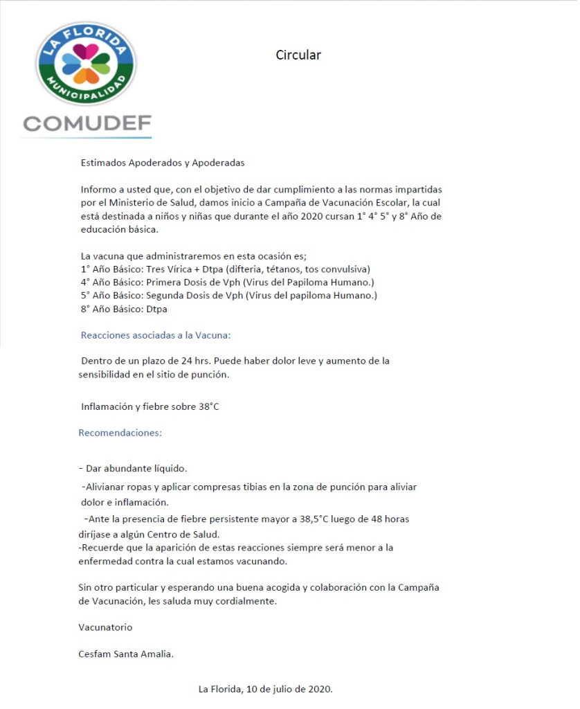 Vacunación masiva, lunes 3 de agosto, a las 9:00 hrs. para alumnos de 1°, 4° y 8° básico.